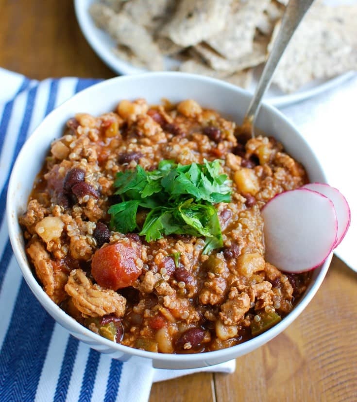 Turkey Quinoa Chili: This hearty, healthy recipe lets you come home to a warm, comforting bowl of chili without spending time in the kitchen.